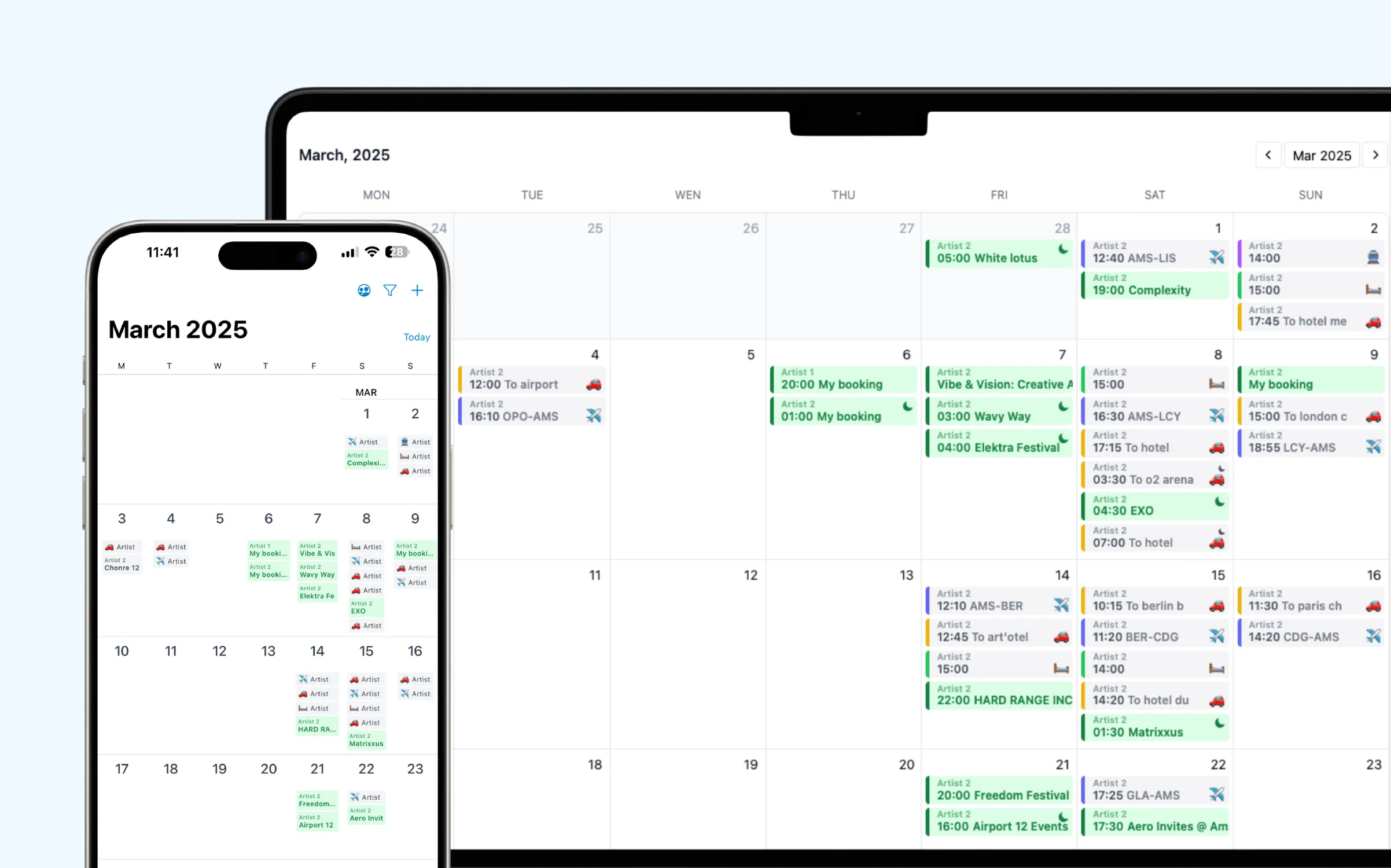 Tutti i booking e la logistica dei tuoi artisti a colpo d'occhio.