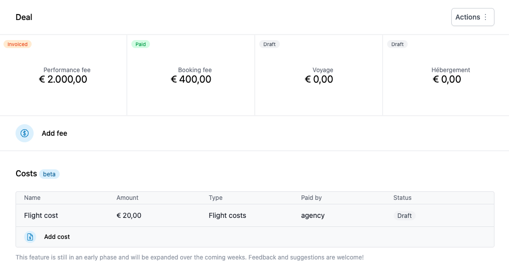 Ora puoi aggiungere i costi direttamente a una prenotazione. Produzione, voli, hotel, diarie. Artistu calcola automaticamente i compensi sull'importo netto.