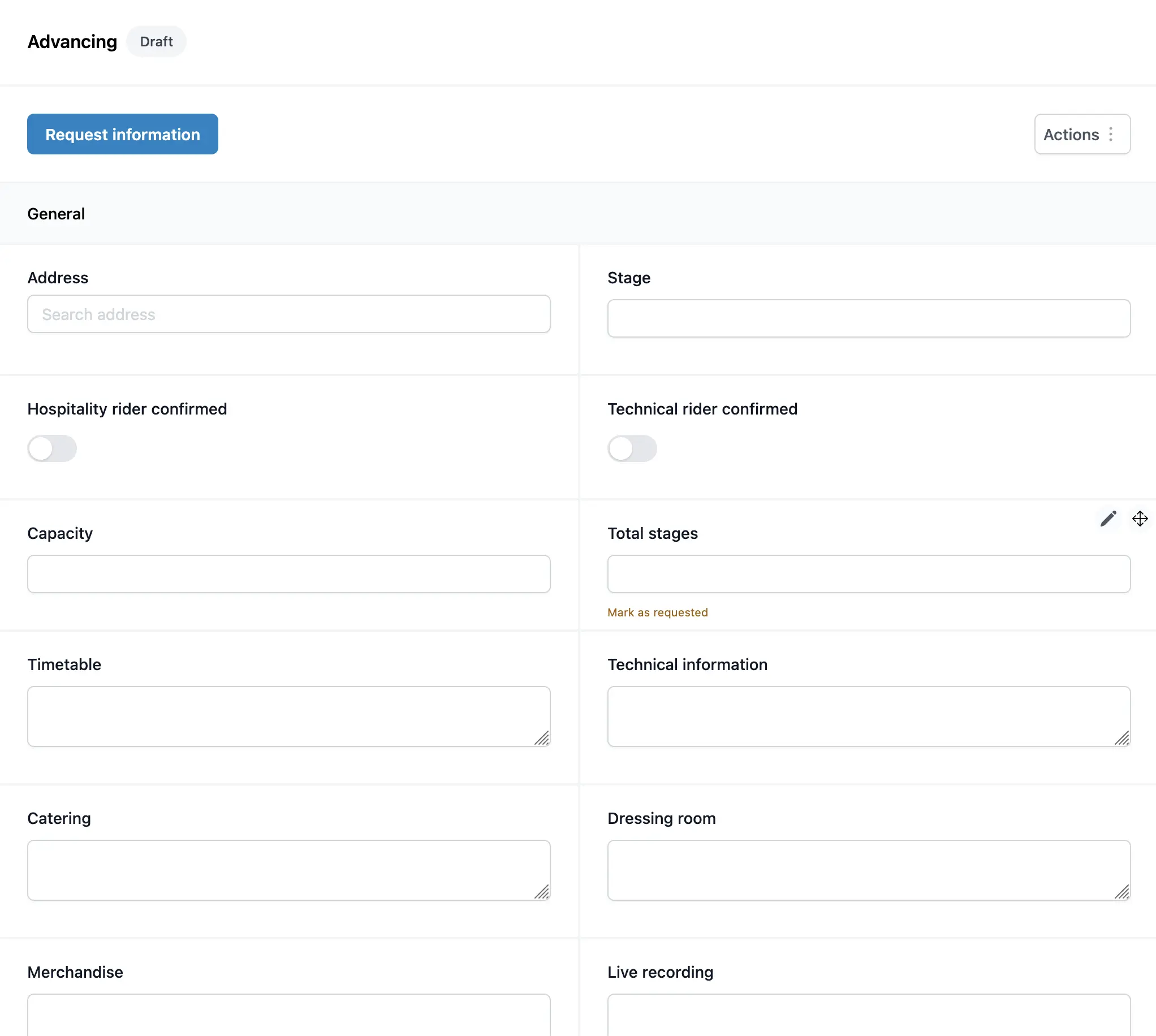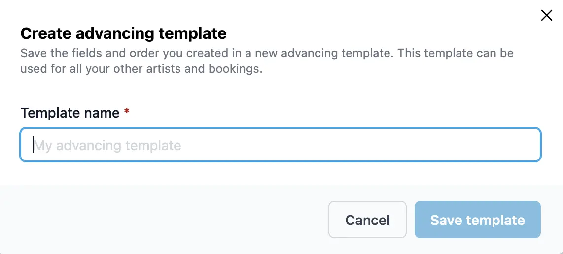 Una delle funzioni più potenti del sistema di advancing di Artistu è la possibilità di salvare le configurazioni dei campi personalizzate come modelli (template). Ciò consente di riutilizzarli per più booking, risparmiando tempo prezioso e garantendo coerenza.