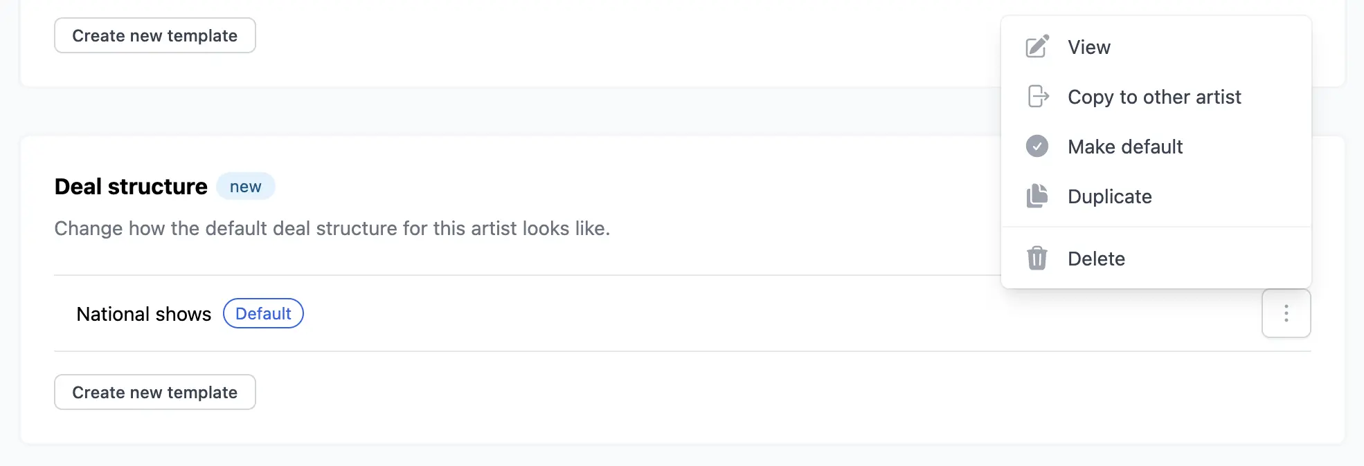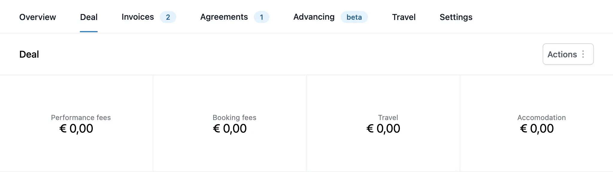 I modelli di accordo per artisti sono utili per impostare i valori predefiniti dei campi dei compensi (deal fee) in una prenotazione. Ciò consente di personalizzare Artistu per mostrare le strutture di accordo utilizzate più frequentemente, risparmiando tempo nella creazione di nuove prenotazioni.