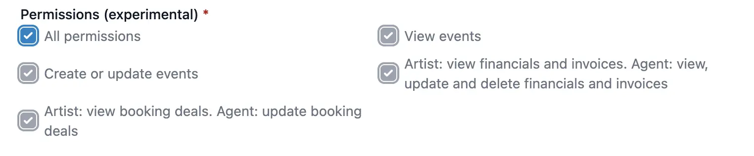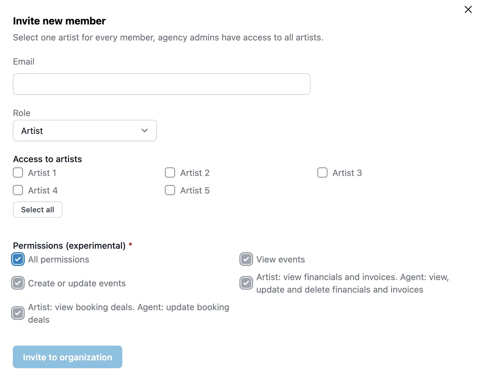 Quando inviti un artista, puoi specificare esattamente cosa può o non può fare con i permessi. Ciò ti consente di controllare il livello di accesso di ogni artista ai propri dati.