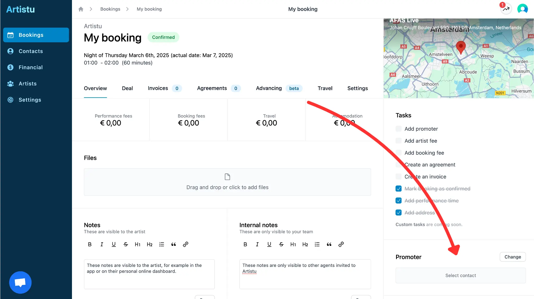 Artistu ti permette di aggiungere sia un "promotore" che un "advancer" alla tua prenotazione. La differenza tra i due è che il "promotore" è la persona che ha prenotato l'artista ed è responsabile della prenotazione. L'"advancer" è la persona responsabile della coordinazione dei viaggi e della logistica.