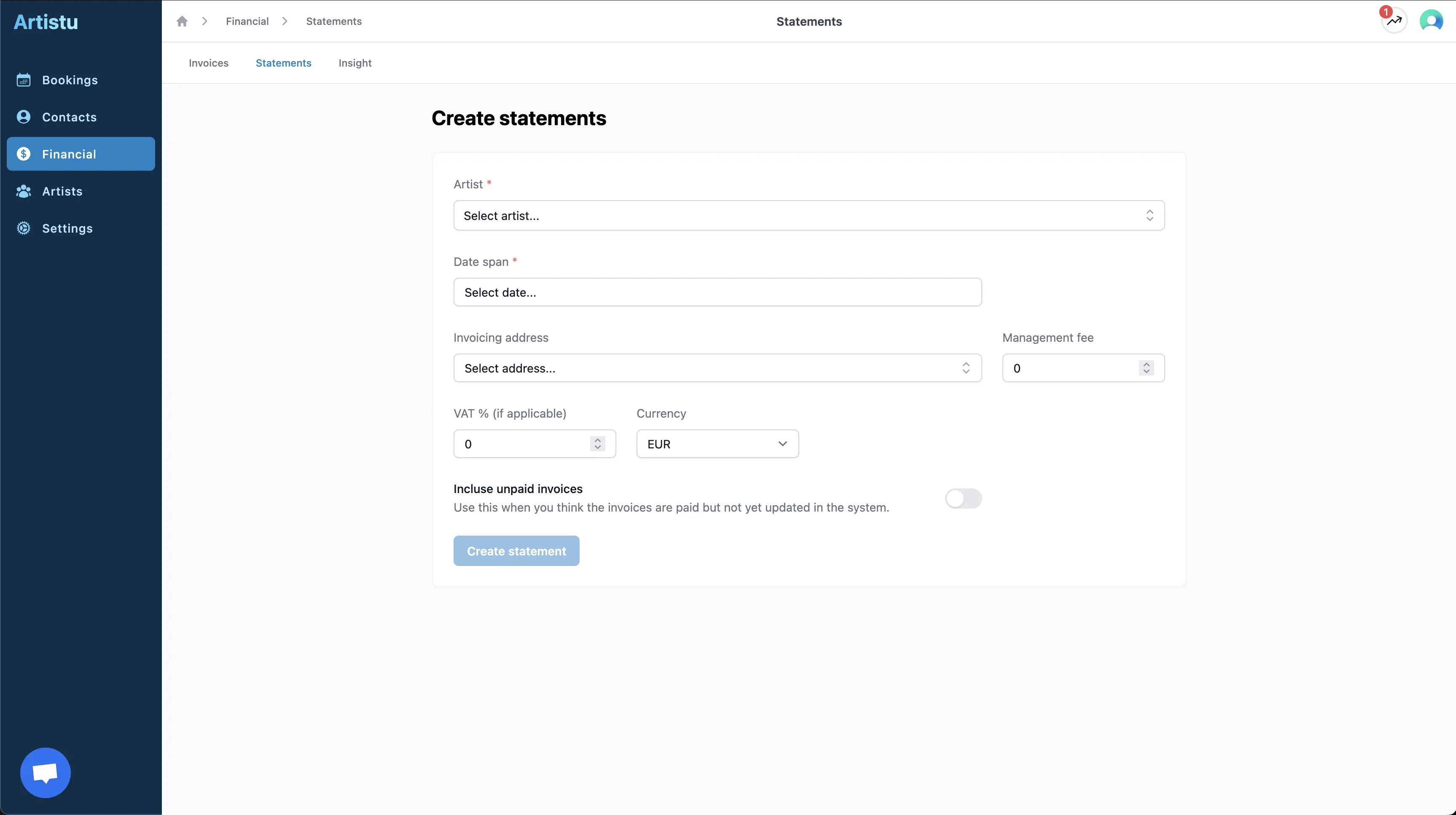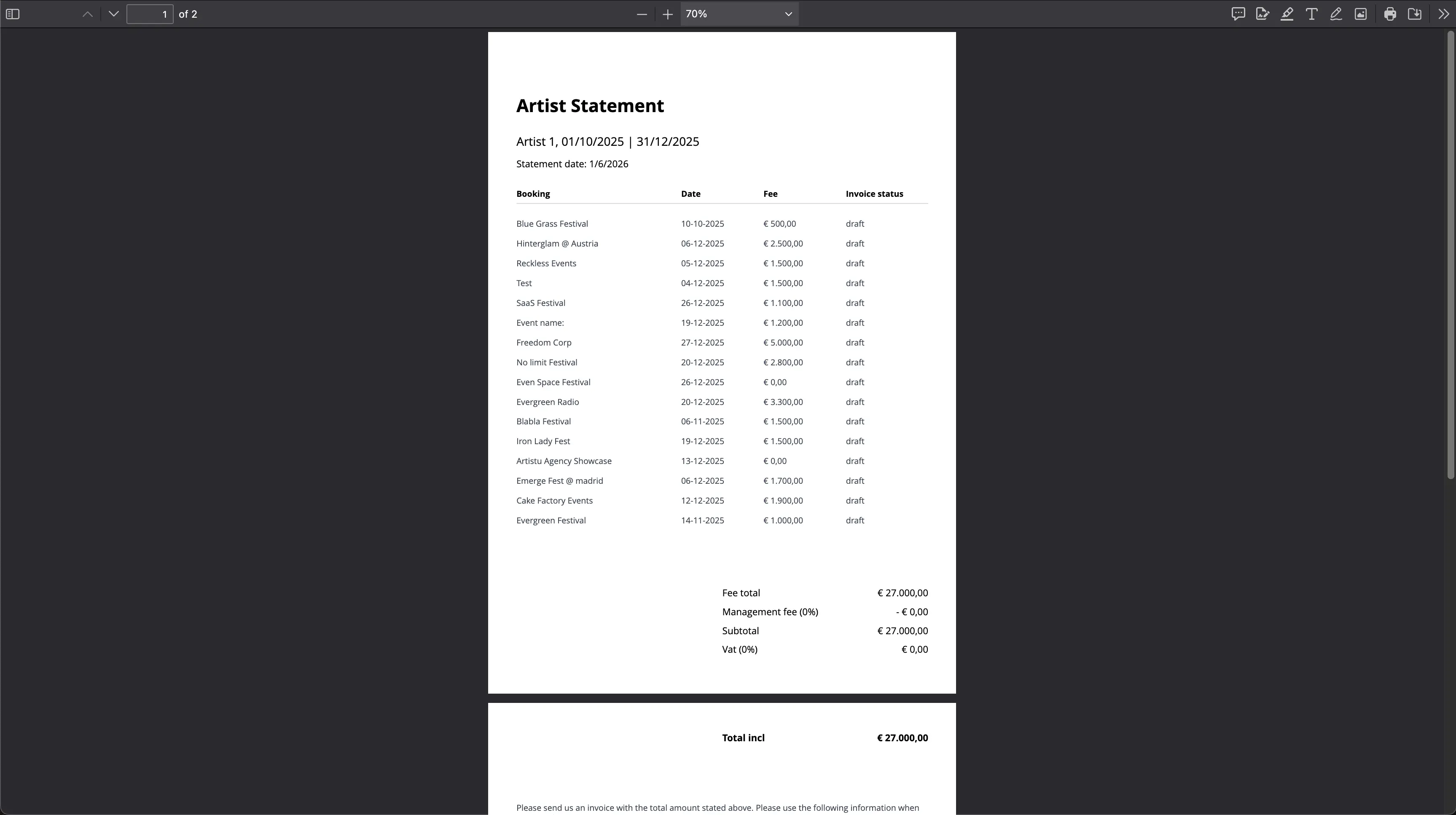 I rendiconti (Statements) forniscono una chiara panoramica di ciò che viene pagato a un artista. Un rendiconto mostra esattamente quali prenotazioni sono state completate, quali importi sono stati riscossi e cosa viene pagato all'artista.